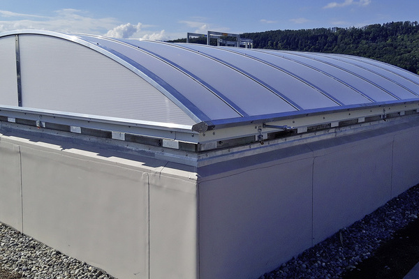 Nicht für den Rauchabzug geeignet aber dennoch zu öffnen ist das 3,50 x 4,50 m große Lichtband. Es wurde in Sonderausführung gebaut und kann später zur Einbringung von Geräten in die Technikzentrale komplett abgenommen, und nach Einbringung wieder einfach aufgesetzt werden.