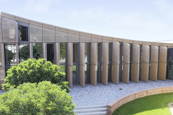 Die individuell für dieses Projekt angefertigten Sonnenschutzklappen, die der Glasfassade vorgelagert sind, können durch den Einsatz spezieller Tandem-Linearantriebe auf ca. 90° aufgefahren werden. Durch das Öffnen dahinter liegender Glasflügel welche mit 24V-RWA-Kettenantrieben ausgestattet sind, und der speziell auf diese Konstruktionskombination abgestimmten Steuerung, wird die Entrauchung sowie eine bestmögliche Be- und Entlüftung sicher gestellt.