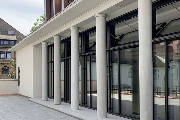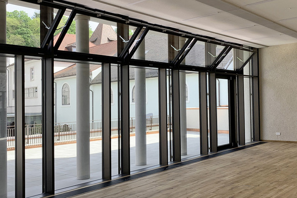 Der große Versammlungsraum im 1. OG wird über 7 Kippflügel im oberen Bereich des Raumes entraucht. Dabei muss unsere Steuerung nicht nur die, netzunabhängige Öffnung der architektonisch ansprechenden Kettenantrieben sicher stellen, sondern auch dafür sorgen, dass im Brandfall auch die davor liegenden 230V Verschattungen, ebenfalls netzunabhängig, mit versorgt und gesteuert werden.